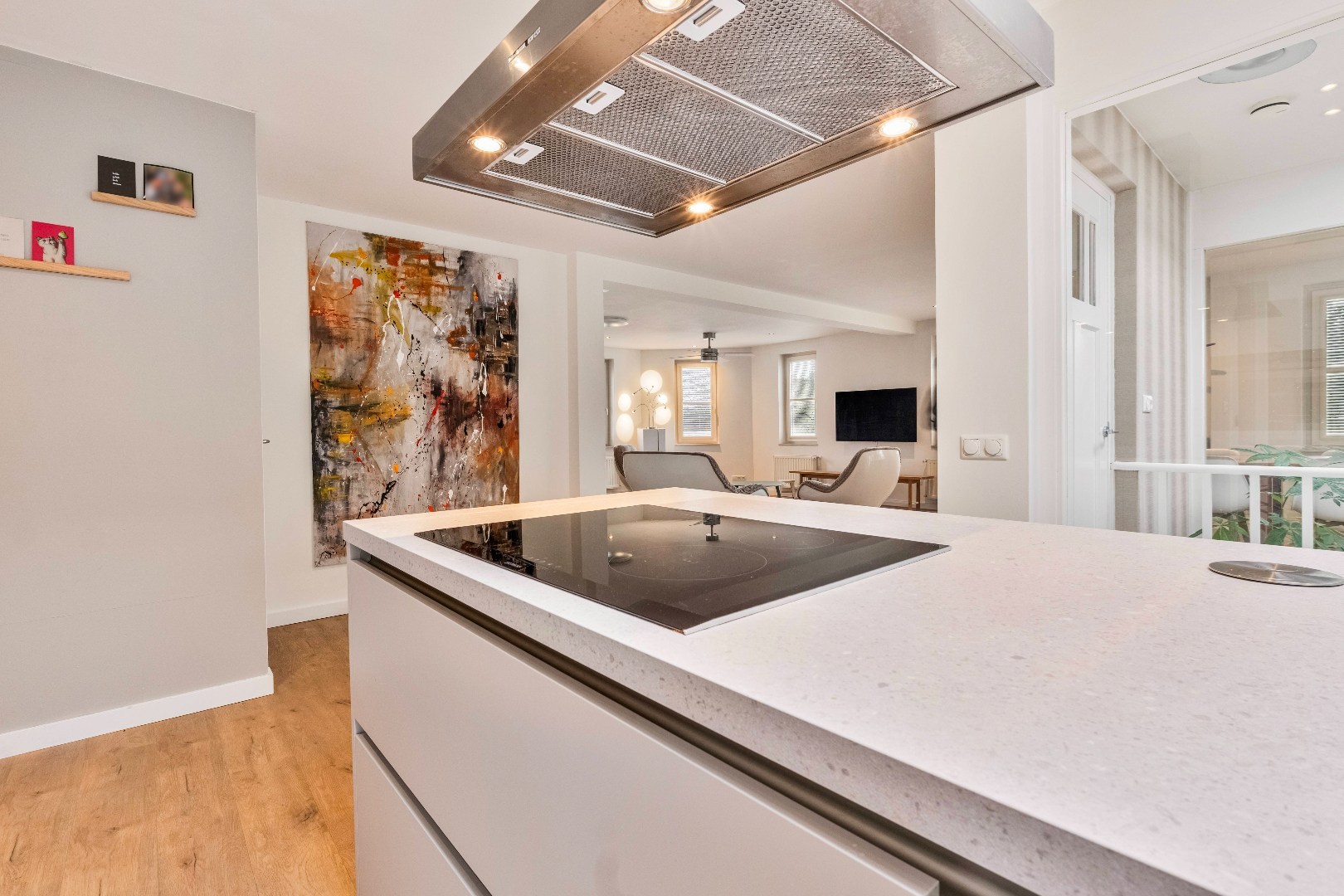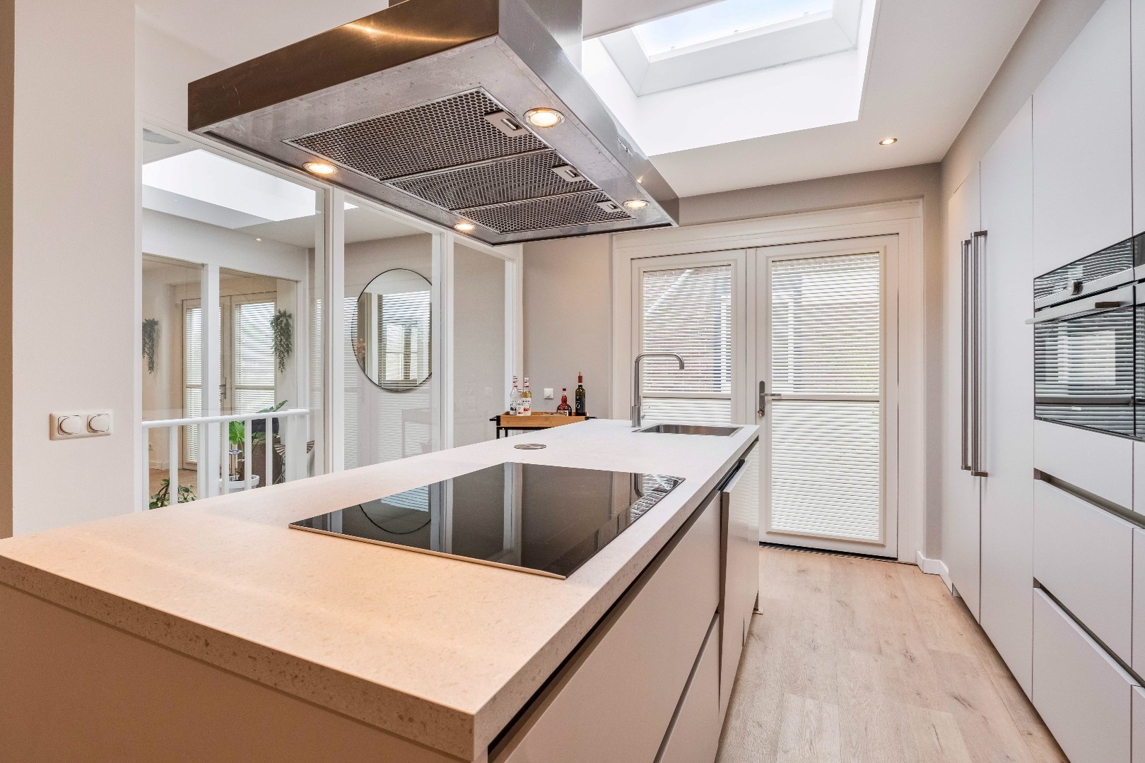 De open woonkeuken vormt een stijlvol middelpunt van de woonruimte en is volledig uitgerust met alle benodigde apparatuur. Denk hierbij aan een 4-pits inductiekookplaat, een afzuigkap, combi-oven met grill, koelkast, vriezer, vaatwasser en zelfs een ingebouwd koffiezetapparaat.