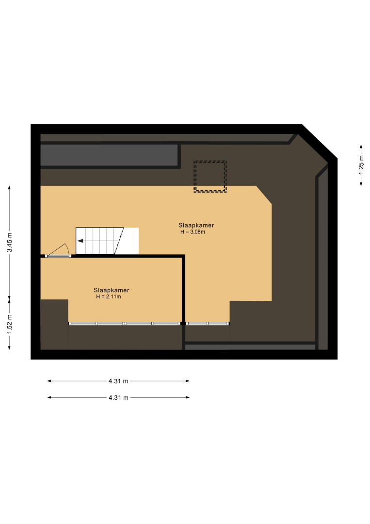 Daarnaast vindt u op deze woonlaag een ruime separate toiletruimte, compleet met een groot wastafelmeubel. Ook bevindt zich hier de eerste slaapkamer van ca. 11 m2.