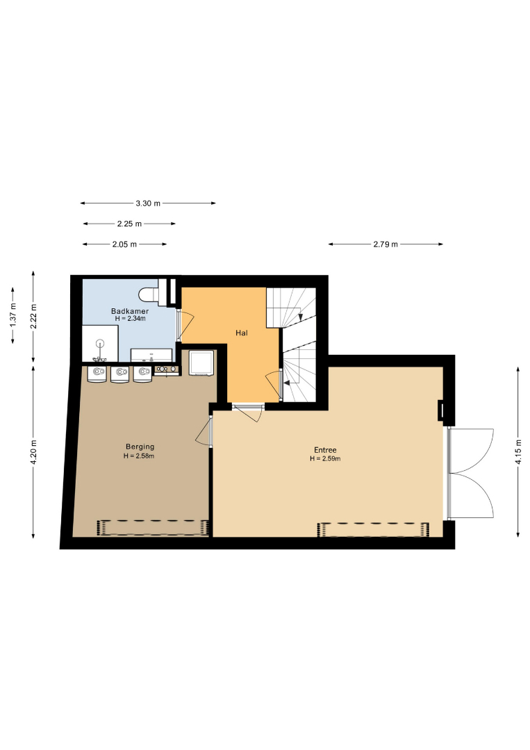 Wanneer u de woning betreedt, komt u direct in een ruime entree van ca. 20 m2 met dubbele openslaande deuren en biedt toegang tot meerdere praktische ruimtes. Zo vindt u hier een ruime berging van ca 14m2 met witgoedaansluiting. Deze ruimte word verwarmd middels vloerverwarming. Tevens is er een grote provisiekelder aanwezig van ca 28 m2.
