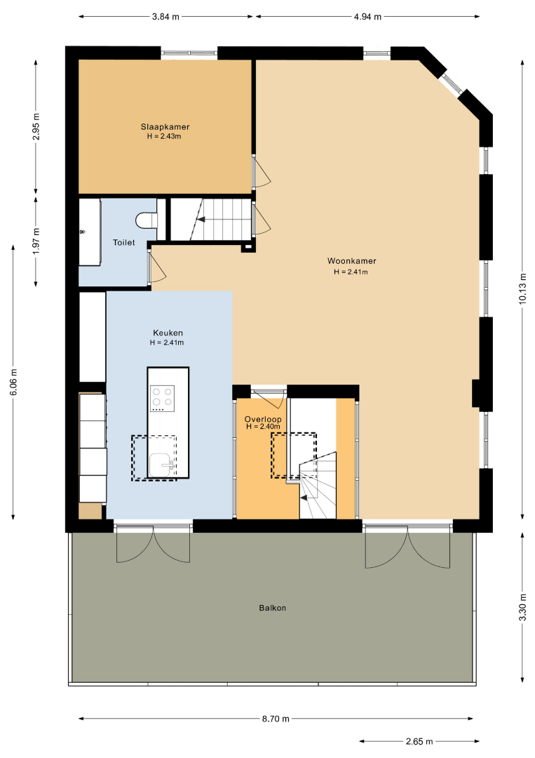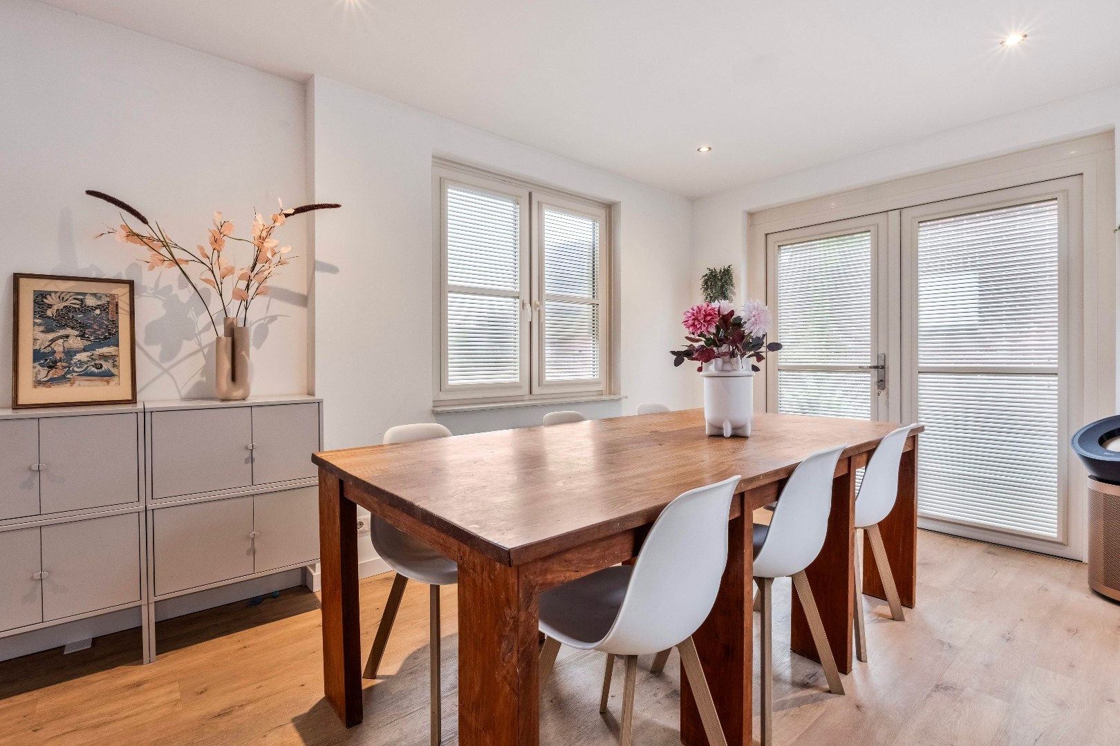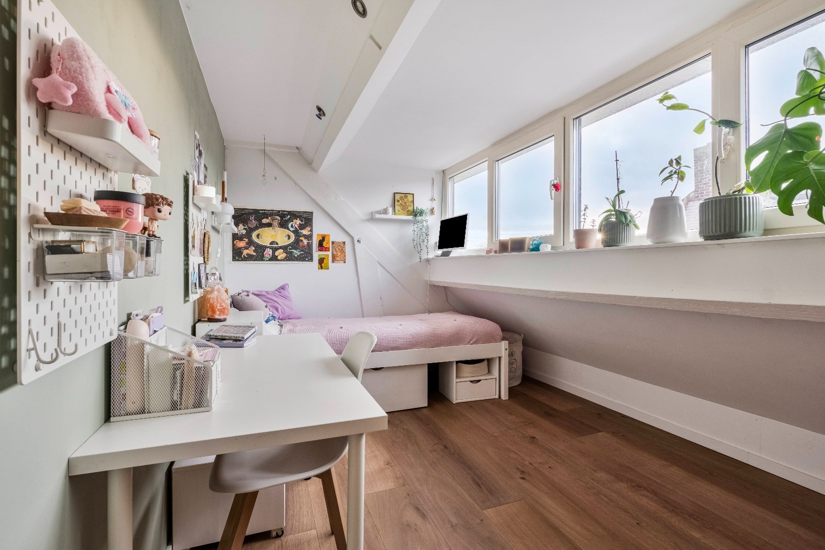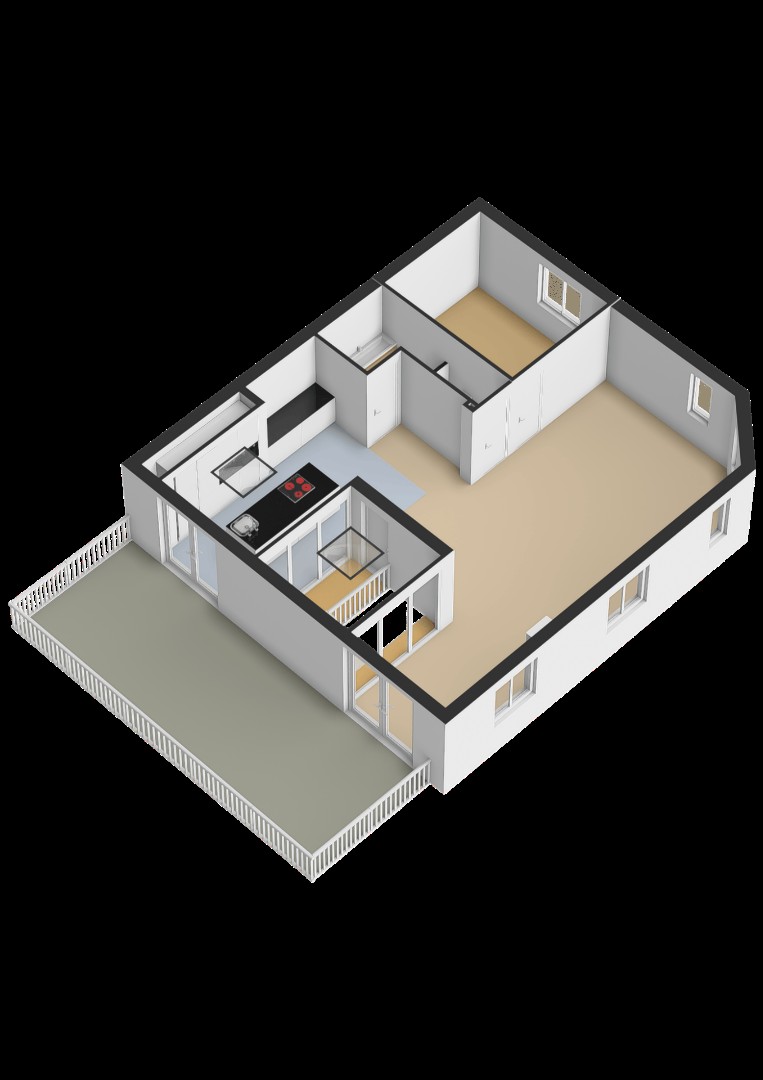 Wat deze verdieping extra bijzonder maakt, zijn de dubbele openslaande deuren in zowel de keuken als de eethoek. Deze geven toegang tot een sfeervol dakterras van ca. 29 m2.