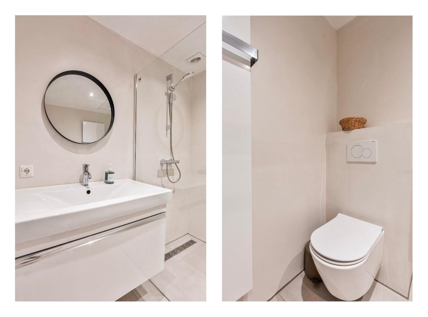 De luxe badkamer van ca 4.5 m2 bevindt zich even eens op de begane grond en is modern afgewerkt. Deze comfortabele ruimte is ingericht met een royale inloopdouche, een hangtoilet, een stijlvolle wastafelmeubelset en een designradiator die zorgt voor aangename warmte en een luxe uitstraling.