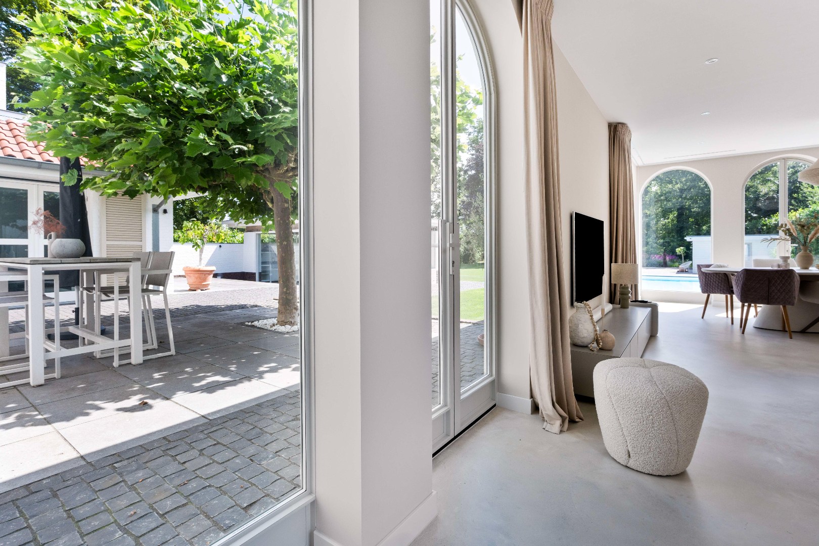 Aansluitend bevindt zich een tweede living, gerealiseerd in een onder architectuur ontworpen aanbouw. Deze ruimte ademt licht en ruimte en versterkt het gevoel van luxe en ontspanning. Het interieur is een harmonieus samenspel van hout, velours, bouclé en natuursteen dat zorgt voor een uitnodigende sfeer waarin comfort en elegantie hand in hand gaan.