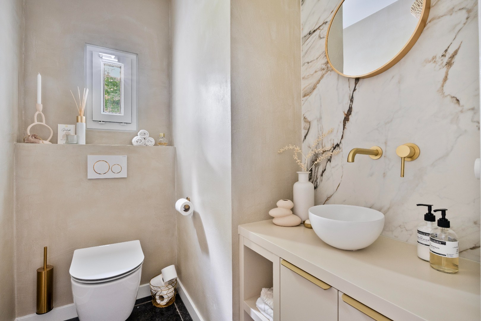 Op de verdieping zet een zorgvuldig samengestelde mix van goud en beige eveneens de toon: goud voor glamour en warmte, beige voor zachtheid en sereniteit. Zoals het gezegde luidt: “De beste kleur in de hele wereld is de kleur die je goed staat.” Hier is dat voelbaar in elke nuance. De vrouw des huizes koos in nauwe samenwerking met de interieurarchitect de kleuren, materialen en accessoires, waardoor elke ruimte een persoonlijk en harmonieus geheel vormt.