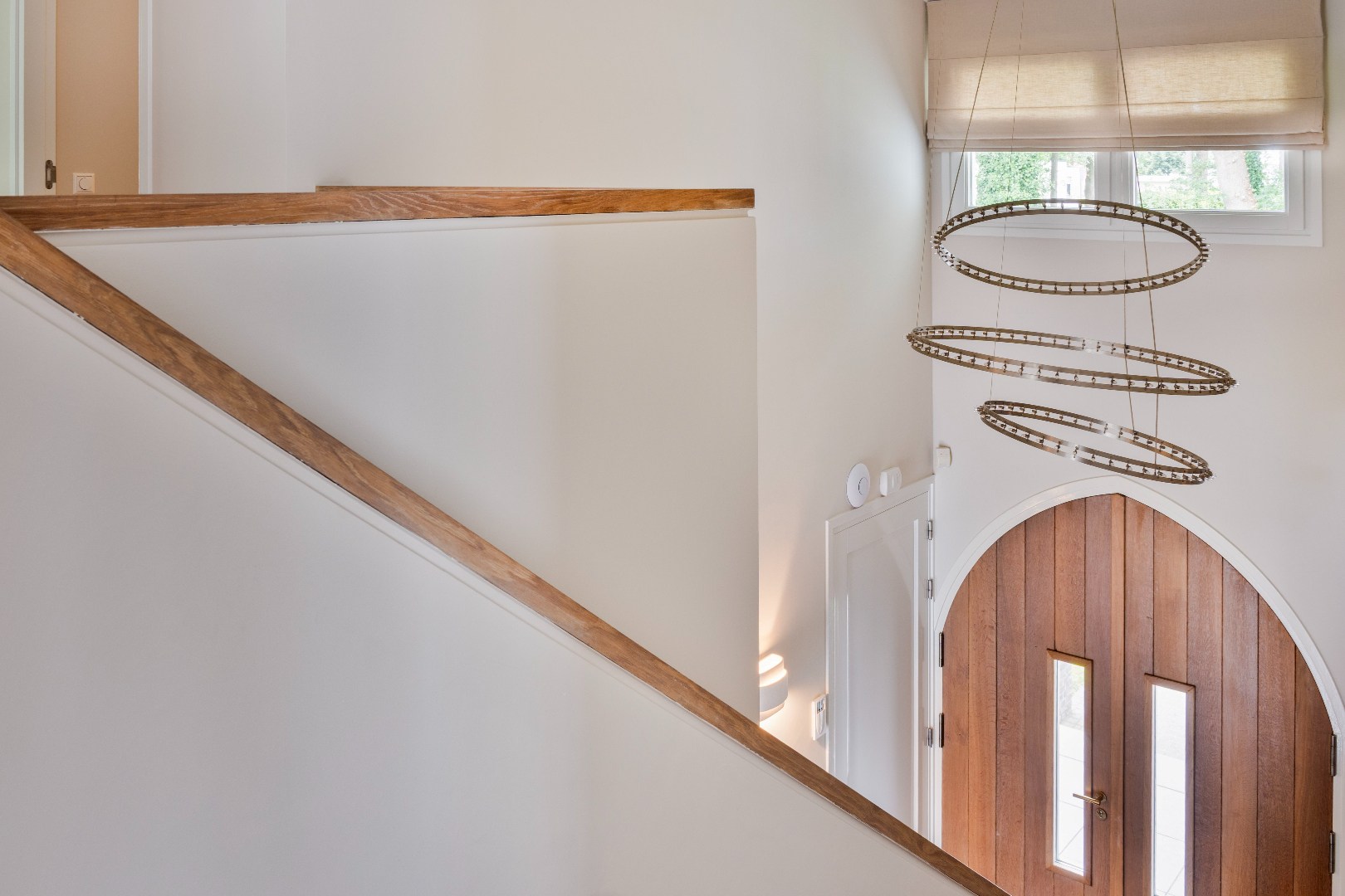 Nog vóórdat je een stap over de drempel zet, wordt de toon gezet. De ambachtelijk vervaardigde kloosterdeur van massief eikenhout vormt een krachtig en karaktervol statement en nodigt uit om verder te ontdekken. Eenmaal binnen ontvouwt zich direct het warme hart van de woning.