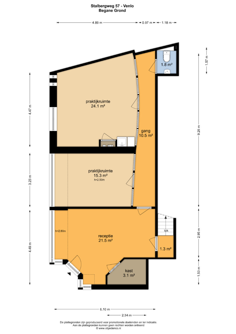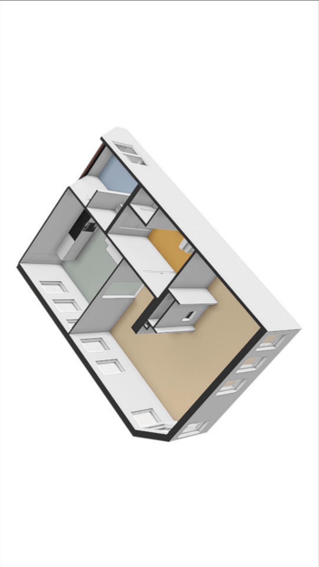 - Gang (10,5m2) met toegang tot 2 ruimtes van ca. 24m2 en 15,5m2 waarvan 1 met keukenblok en 1 met wastafel/meubel.