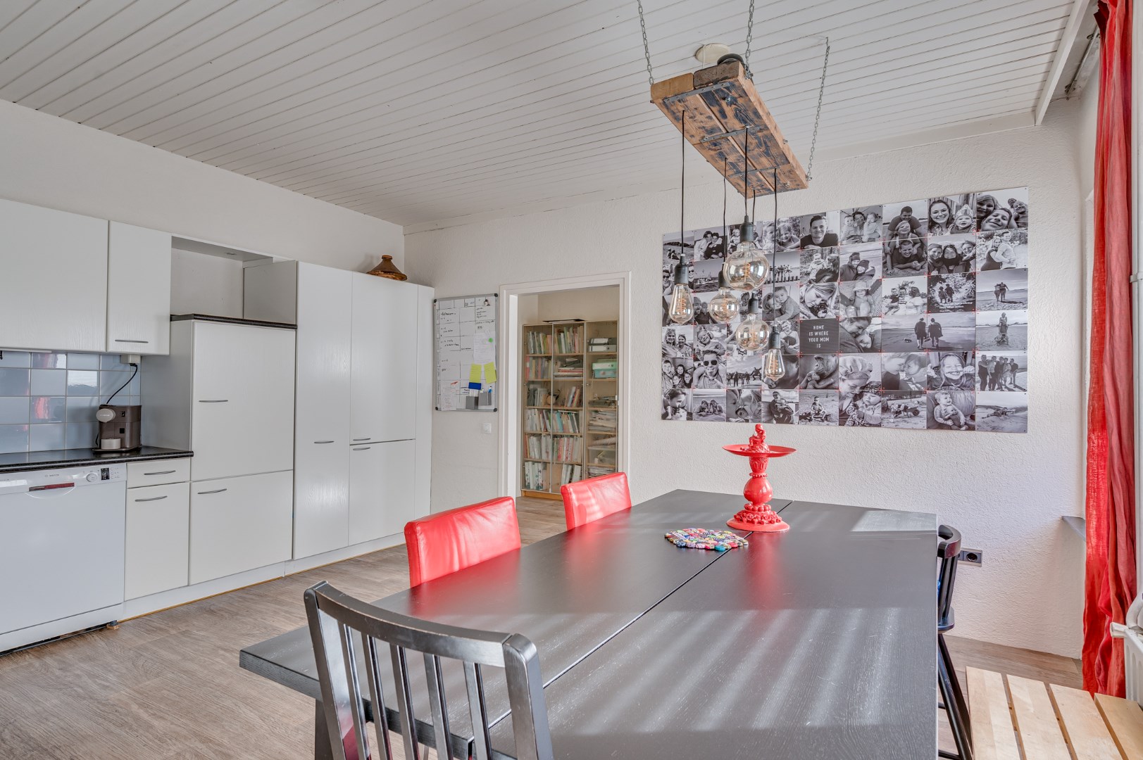 - Woonkamer (ca. 38m2) met hout gestookte openhaard. Woonkeuken (ca. 20m2) met keukenblok voorzien van diverse inbouwapparatuur (o.a. koelkast, diepvries, vaatwasser, 4-pits gasfornuis, magnetron, oven en afzuigkap. Handige en ruime inbouwkast.