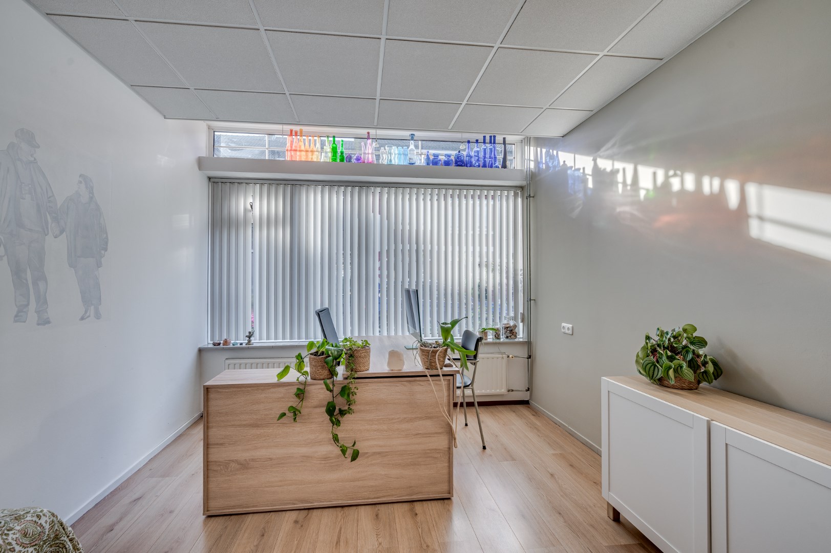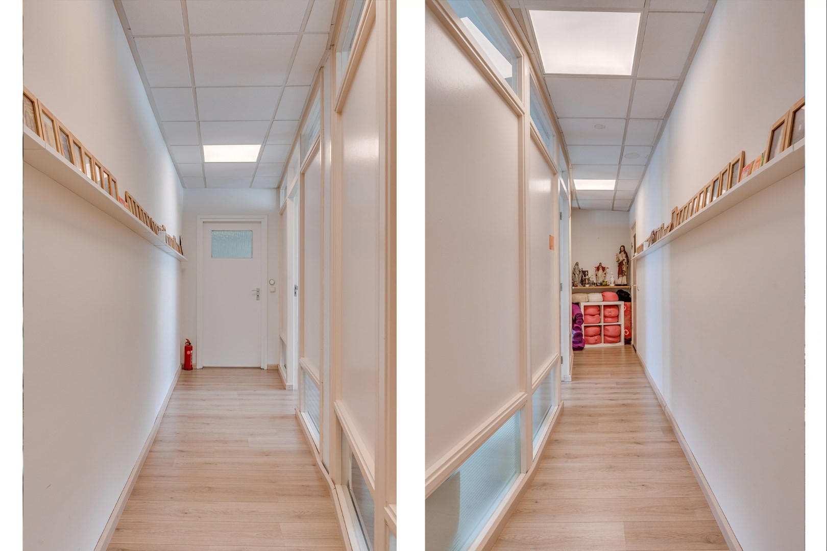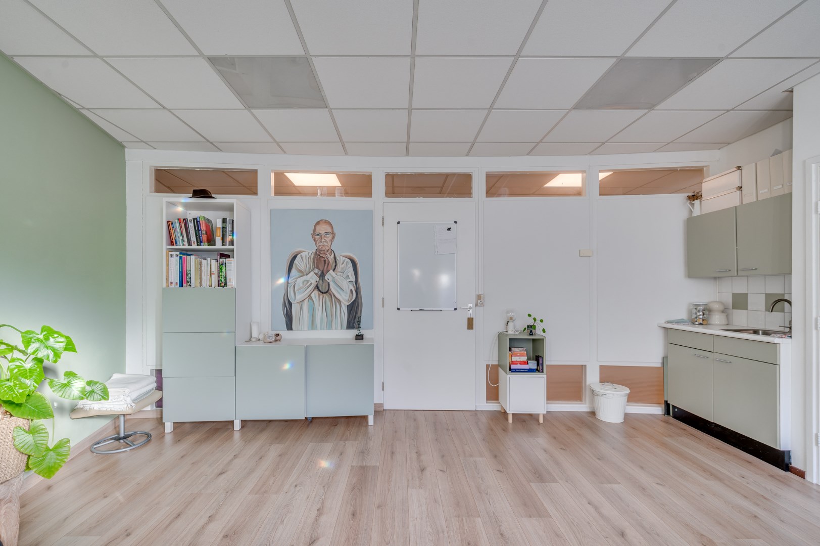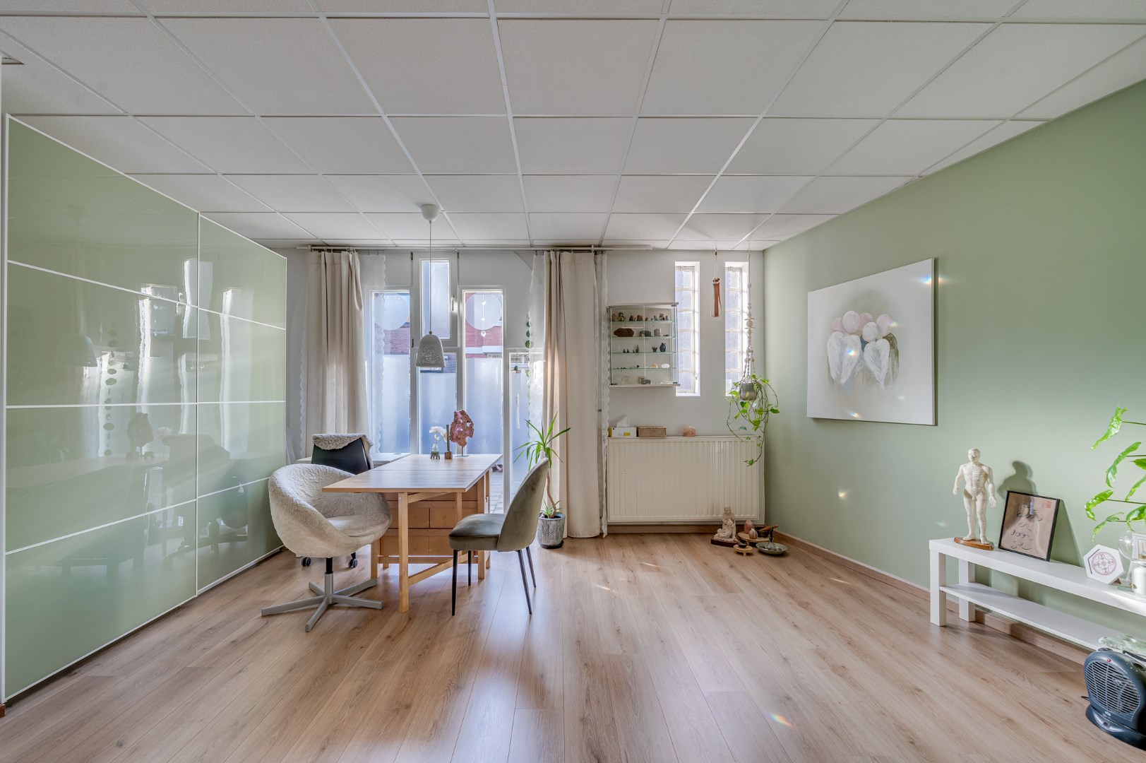 - Overal liggen hoogwaardige laminaatvloeren en zijn de ruimtes voorzien van net afgewerkte systeemplafonds met inbouwverlichting.