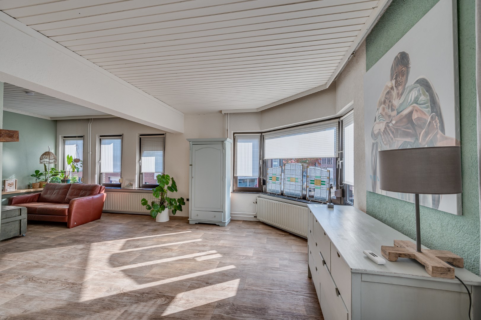 - Bij binnenkomst valt meteen de overvloed aan natuurlijk licht op dankzij de grote raampartijen, met glas-in-lood ramen! Dit geeft de ruimtes een open en ruimtelijk gevoel.