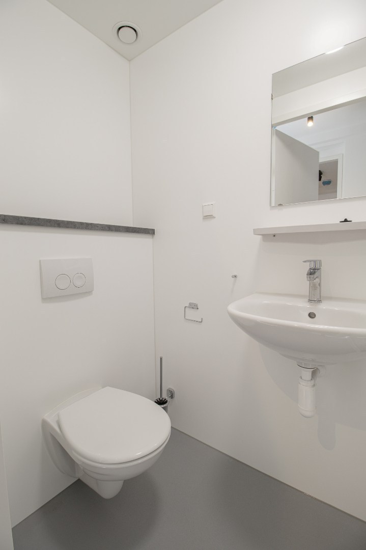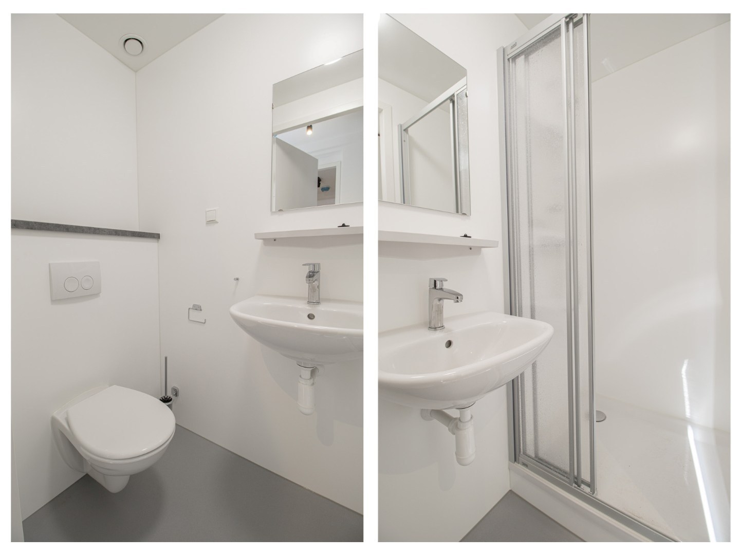De badkamer is stijlvol afgewerkt met een douchecabine, hangend toilet en wastafel met spiegel.