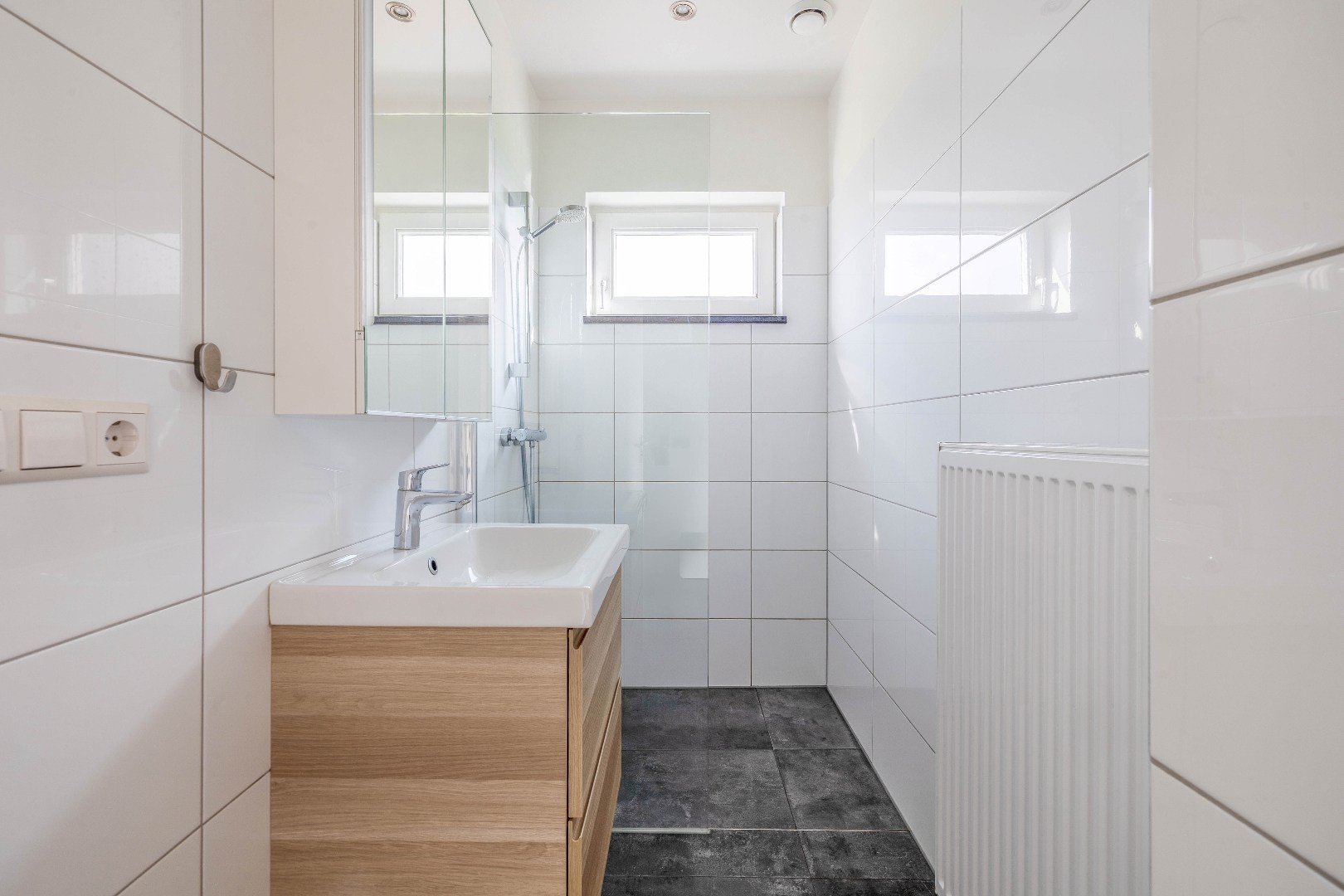 Een hal biedt toegang tot de 2 toiletten met fonteintjes, de 2 badkamers met een inloopdouche, wastafelmeubel, raam en vloerverwarming en de bijkeuken met witgoedaansluiting en loopdeur naar de tuin.