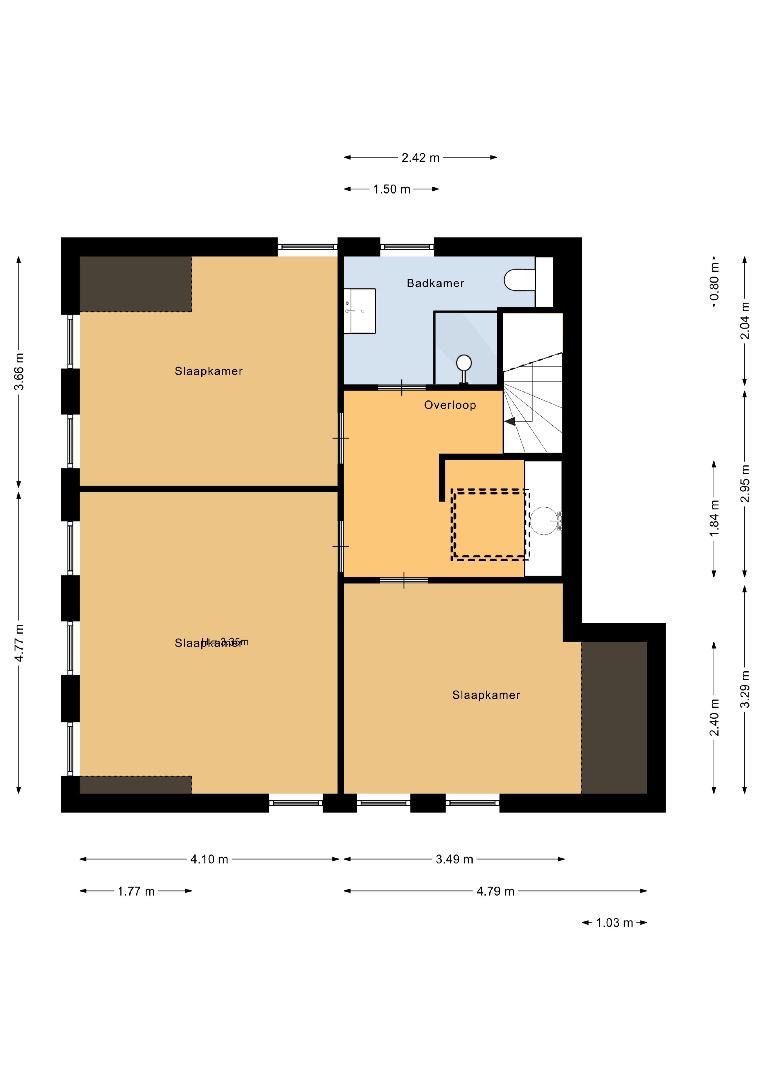 Op de eerste verdieping ligt een doorlopende laminaatvloer. Op de overloop is het keukenblok voorzien van een koelkast en close-in boiler. Er is een Velux dakraam aanwezig. Vanuit de overloop zijn de 3 slaapkamers en de badkamer bereikbaar.