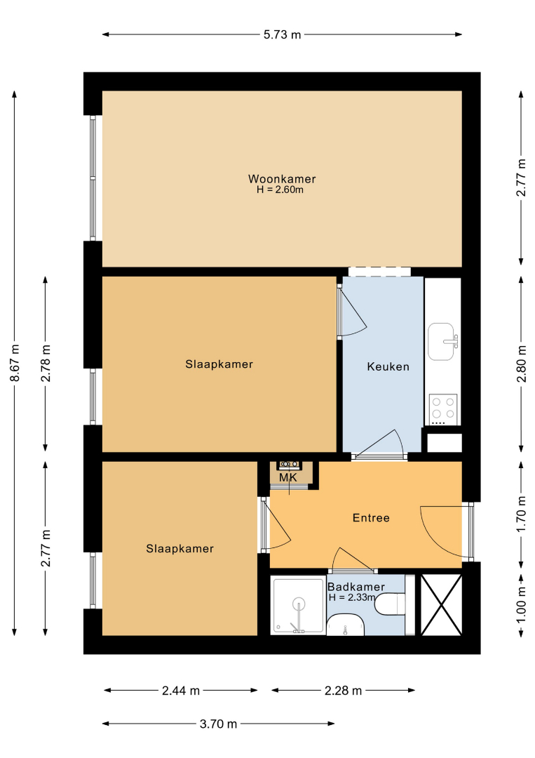 De moderne keuken beschikt over een inductiekookplaat, oven en afzuigkap, en heeft tevens een aansluiting voor een wasmachine.
